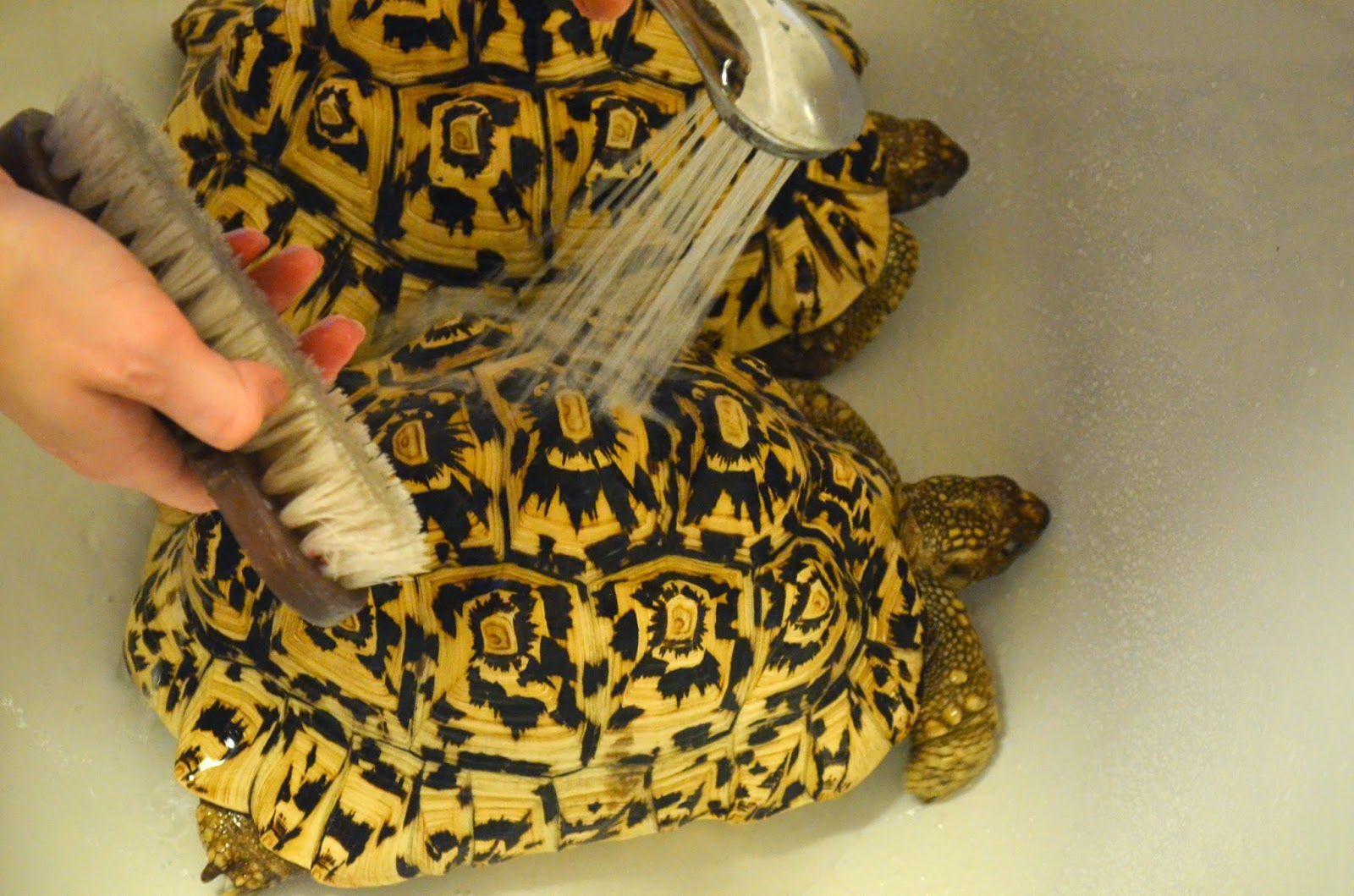 Tyto dvě suchozemské želvy pardálí chová moje kamarádka doma. Jsou to sestry - Wiki a Rozárka. Když si je Kája před deseti lety koupila, bylo jim okolo 5 měsíců a byly velké asi jako pingpongový míček. Teď už jim je oběma 10 a půl roku, jsou velké cca 30 cm na délku a žijí v obrovském teráriu 2x2m, dokonale přizpůsobeném jejich nejideálnějším podmínkám (i teplotně + tam mají mírně vlhko). V teráriu je i světelný časovač. Mají 100% přírodní půdu (podestýlku) vytvořenou z písku, drceného kokosu a rašeliny. Pijí vodu a jedí zelný salát, listy pampelišek, doplňkové krmivo pro plazy (vápník, kyselina listová, atd.) ale občas i slámu, jahody nebo mrkve. Koupají se jednou za čas, když už jsou hodně špinavé. Vykartáčují se a užijí si koupel. Opravdu se jim to líbí a ve vodě se s nadšením rochní. Po koupeli se pořádně usuší a namaže se jim krunýř speciálním olejíčkem na jeho posílení. Poté ještě dostanou za odměnu nějaké dobrůtky.